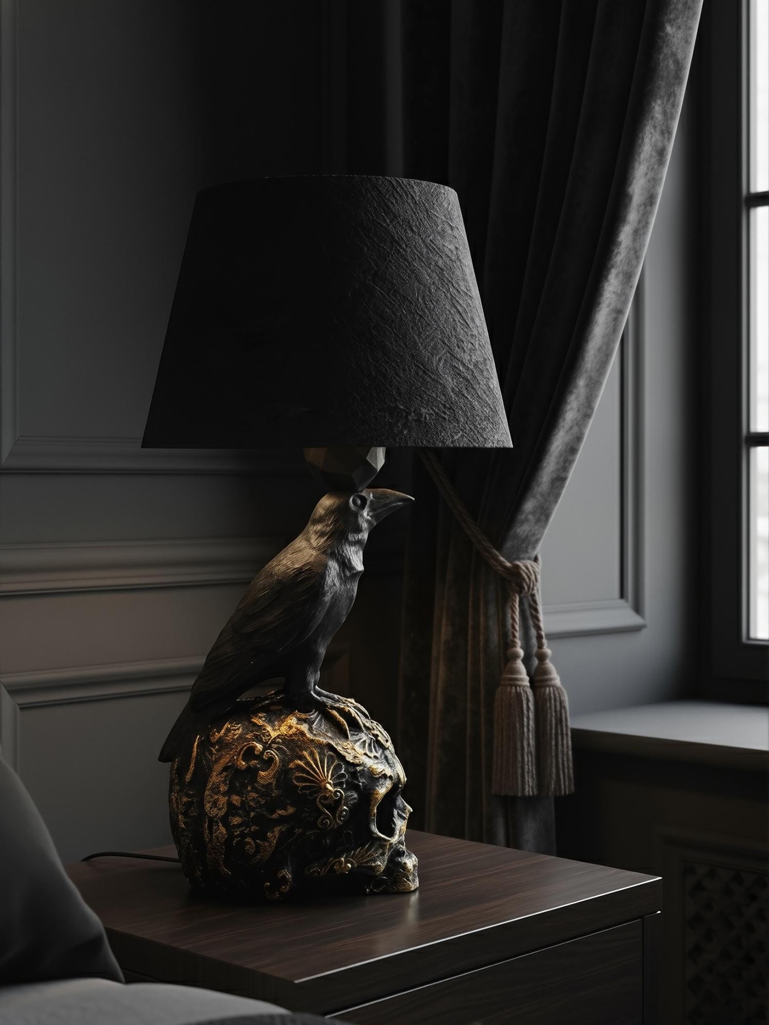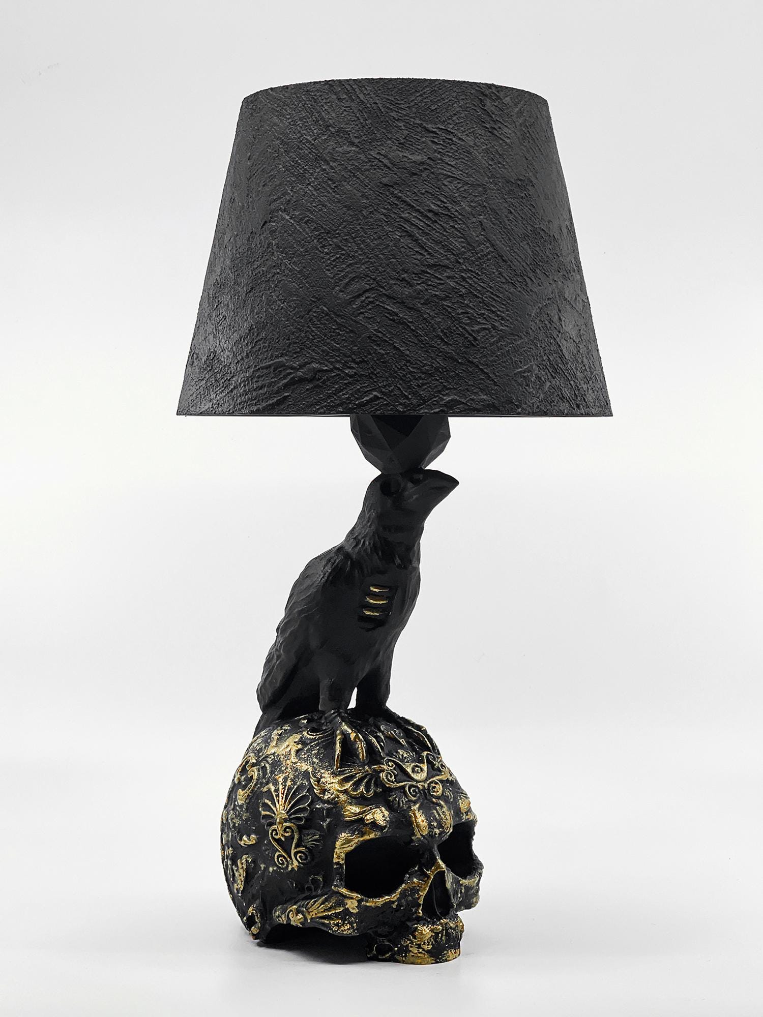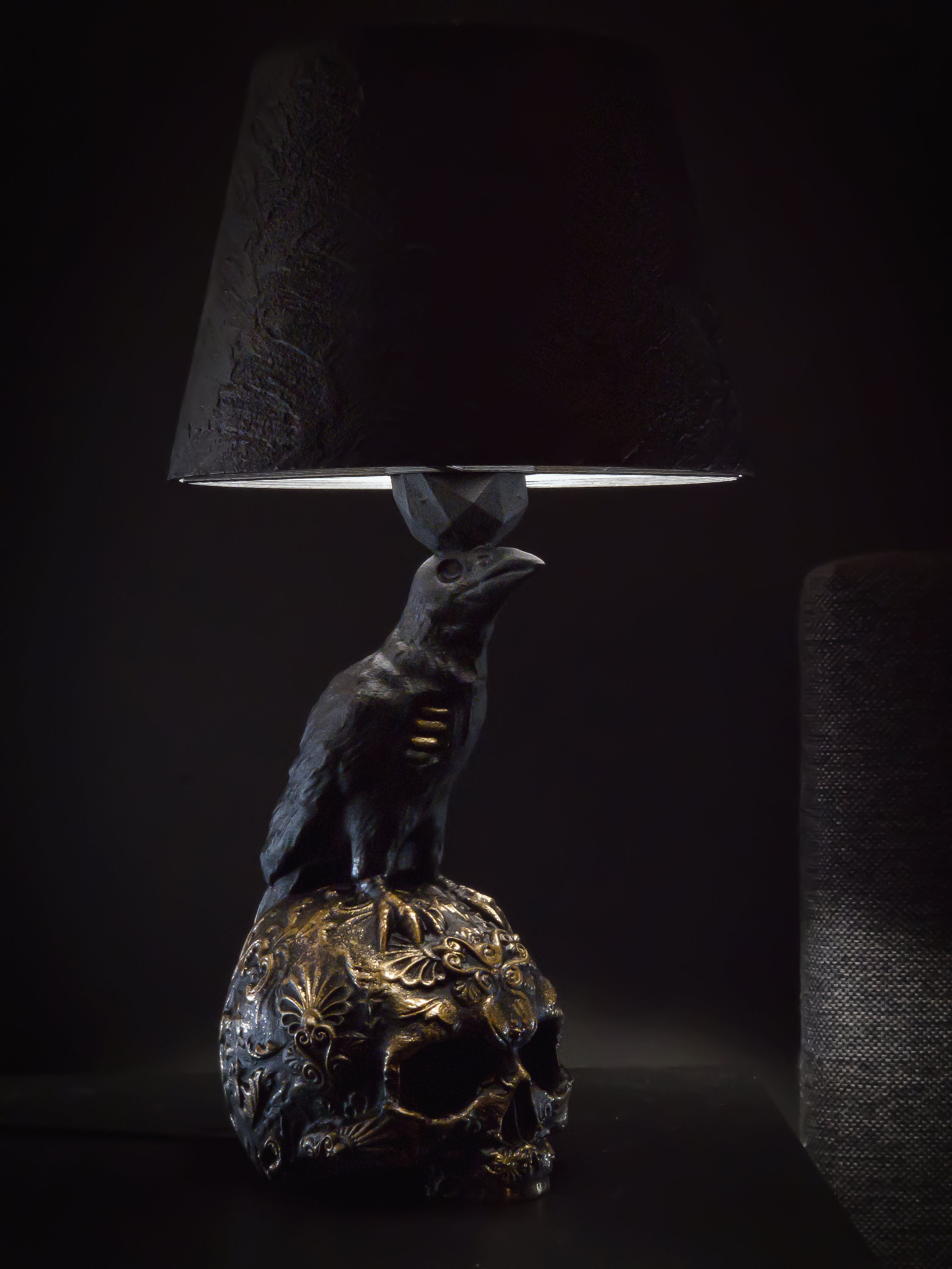 Lámpara de mesa con forma de cráneo de cuervo: acabado a mano – Elegante y evocadora percha de cuervo – Pieza decorativa gótica para el hogar