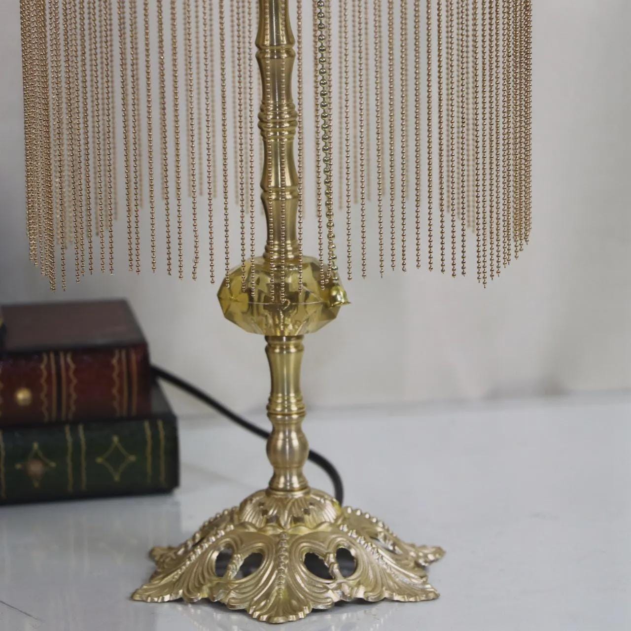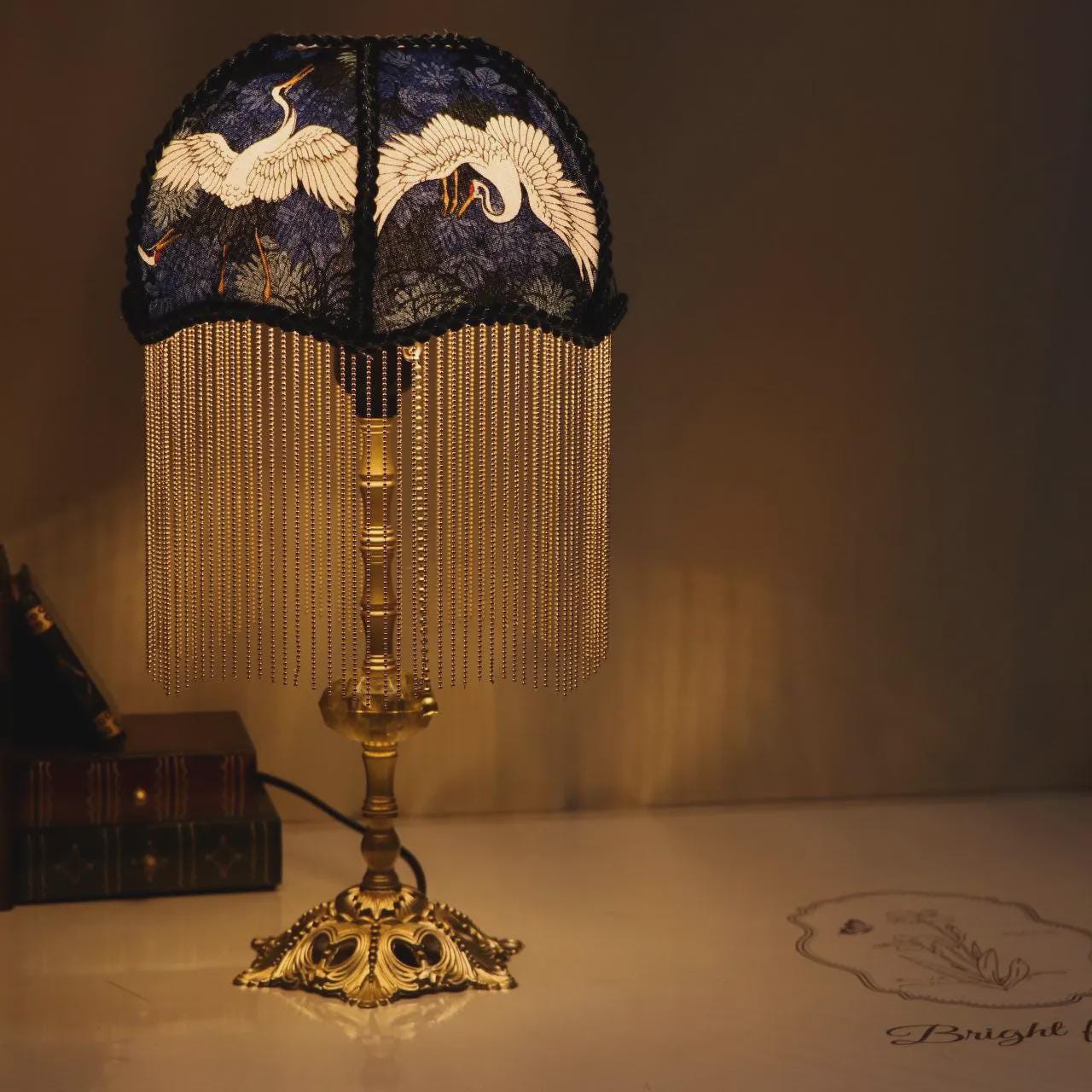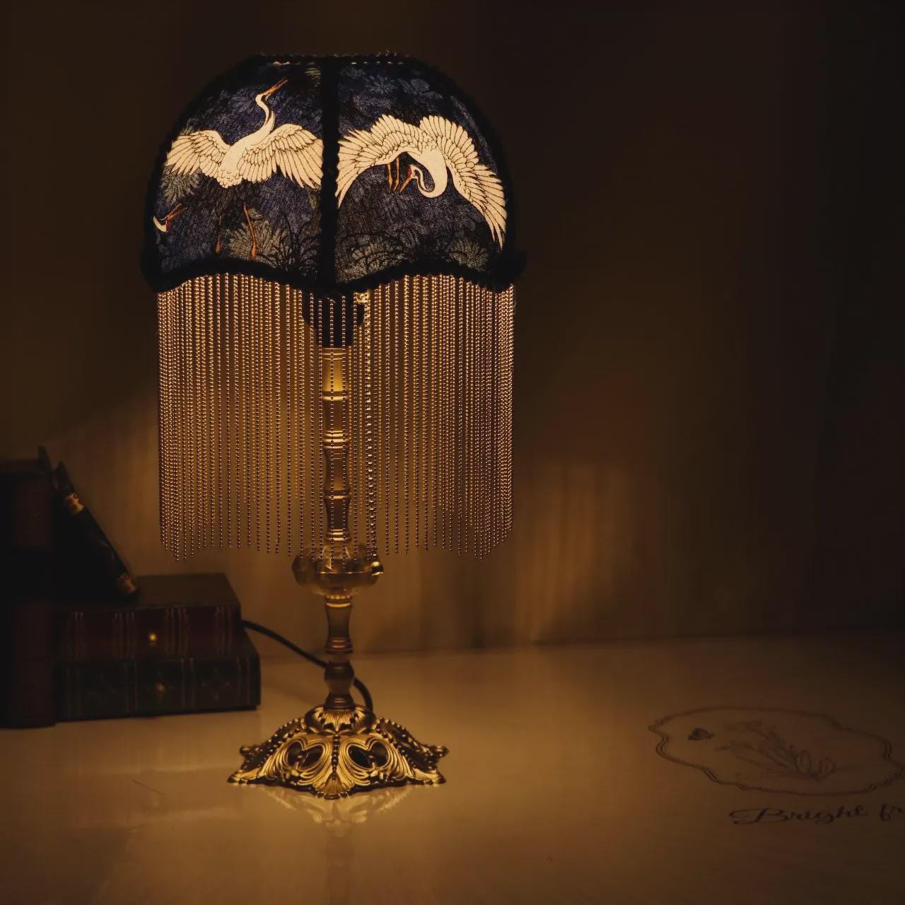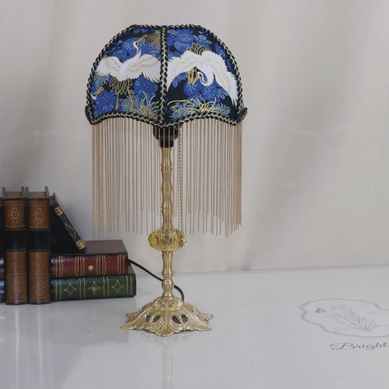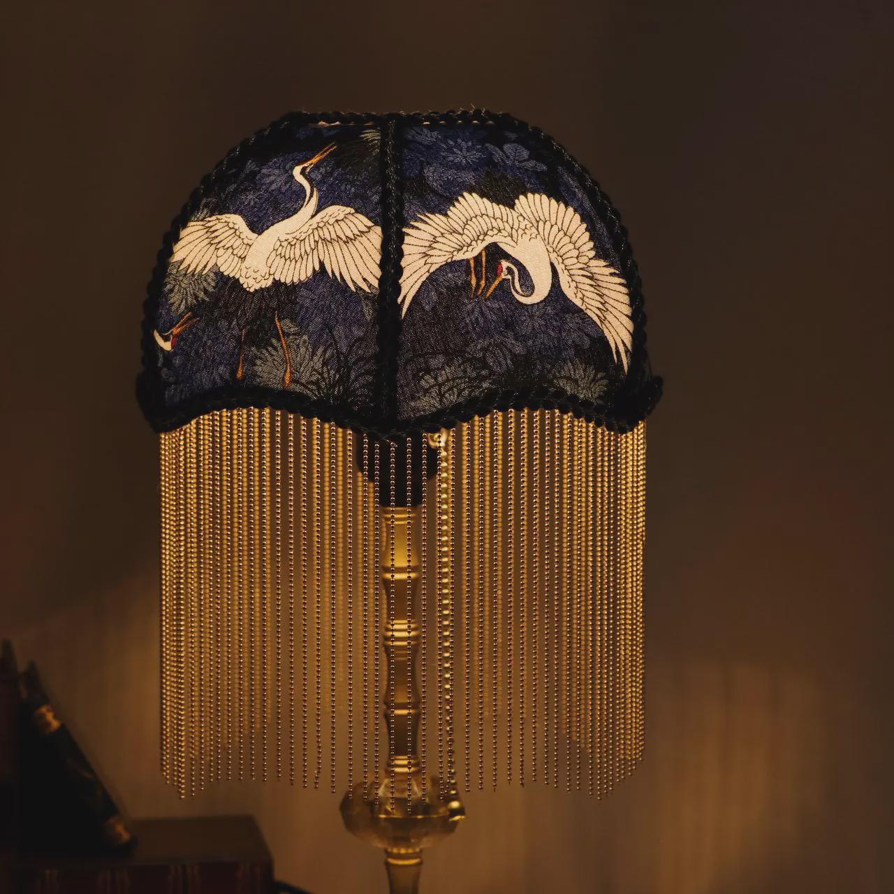 Lámpara de mesa con forma de grúa de latón hecha a mano: lámpara de escritorio retro con borlas para dormitorio, regalo de inauguración de la casa.