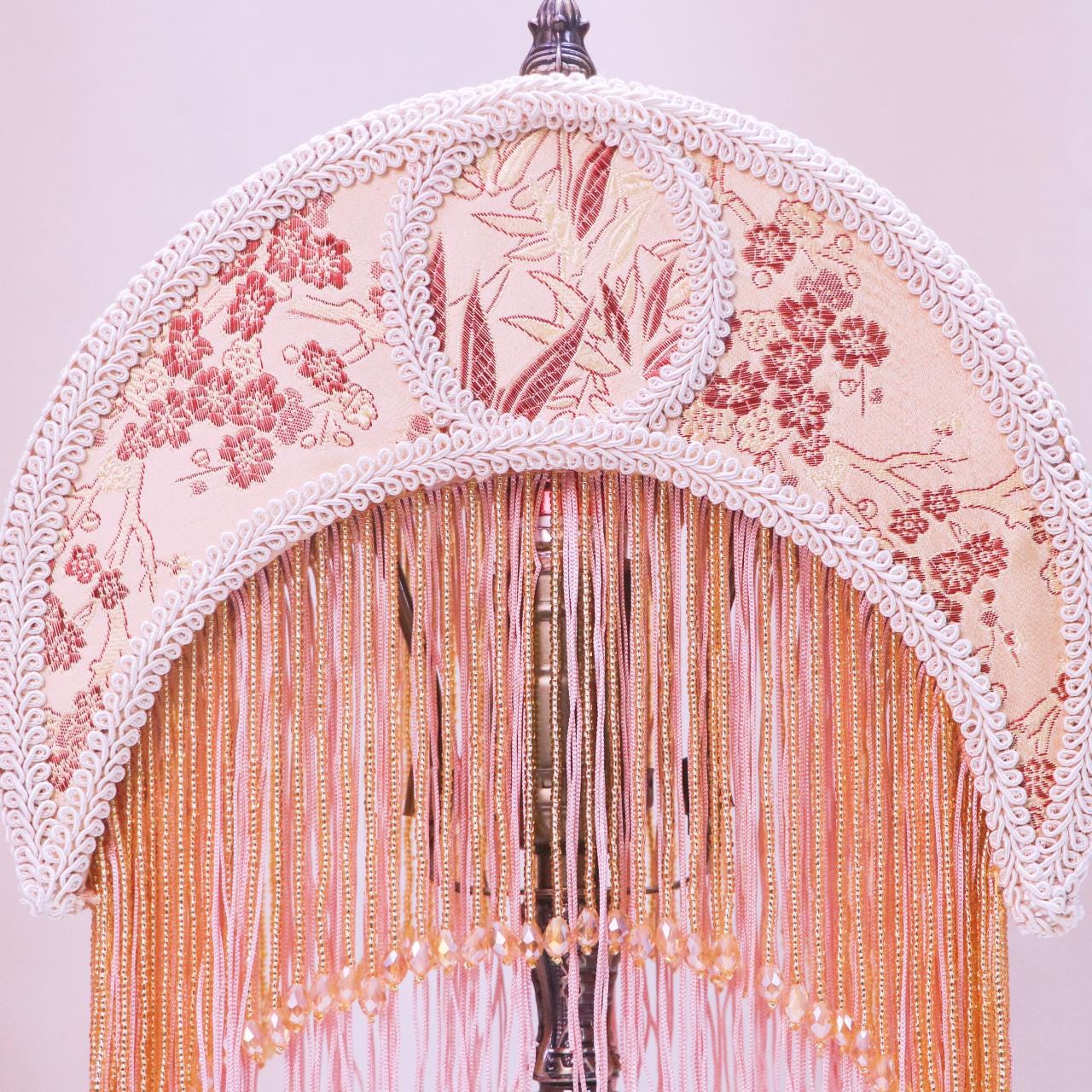 Lámpara de mesa retro con forma de luna hecha a mano: detalles en rosa y borlas