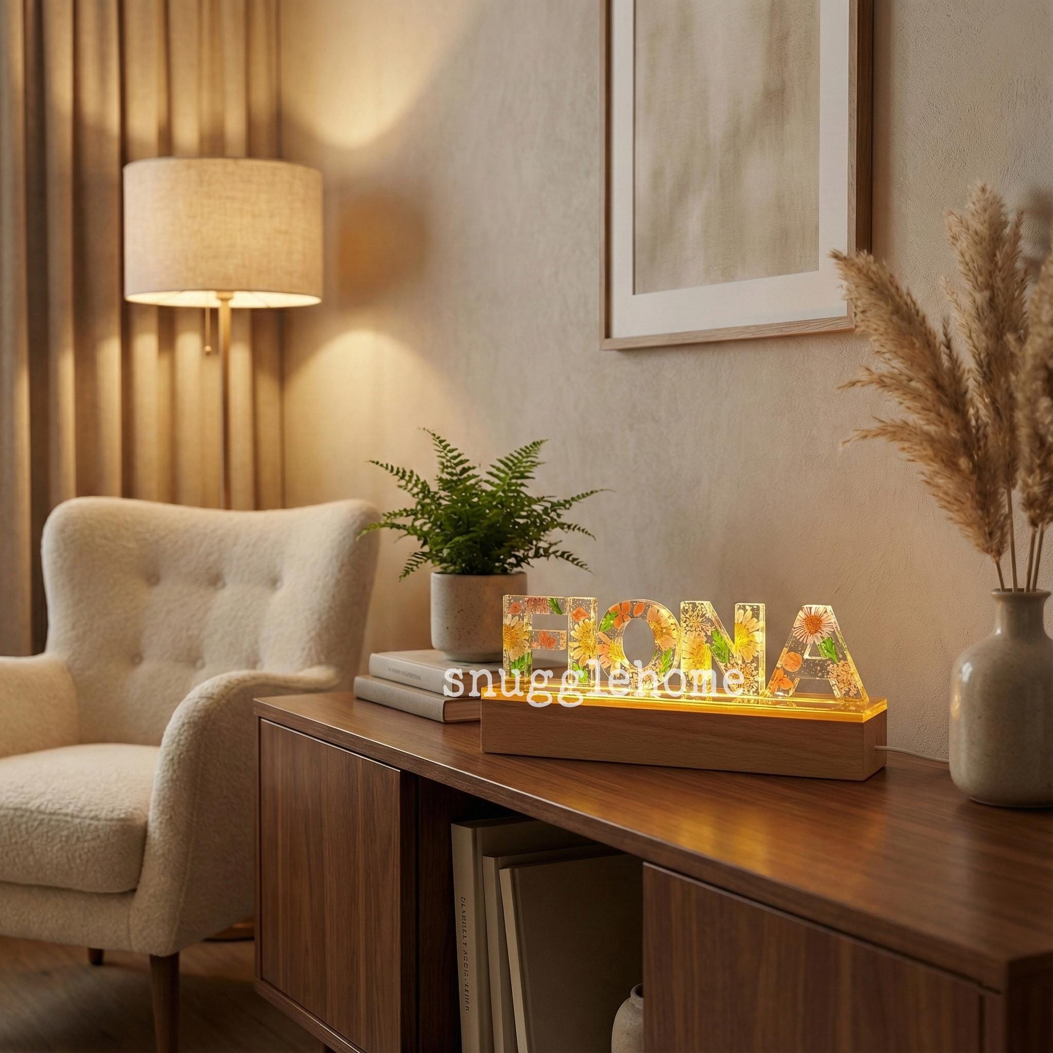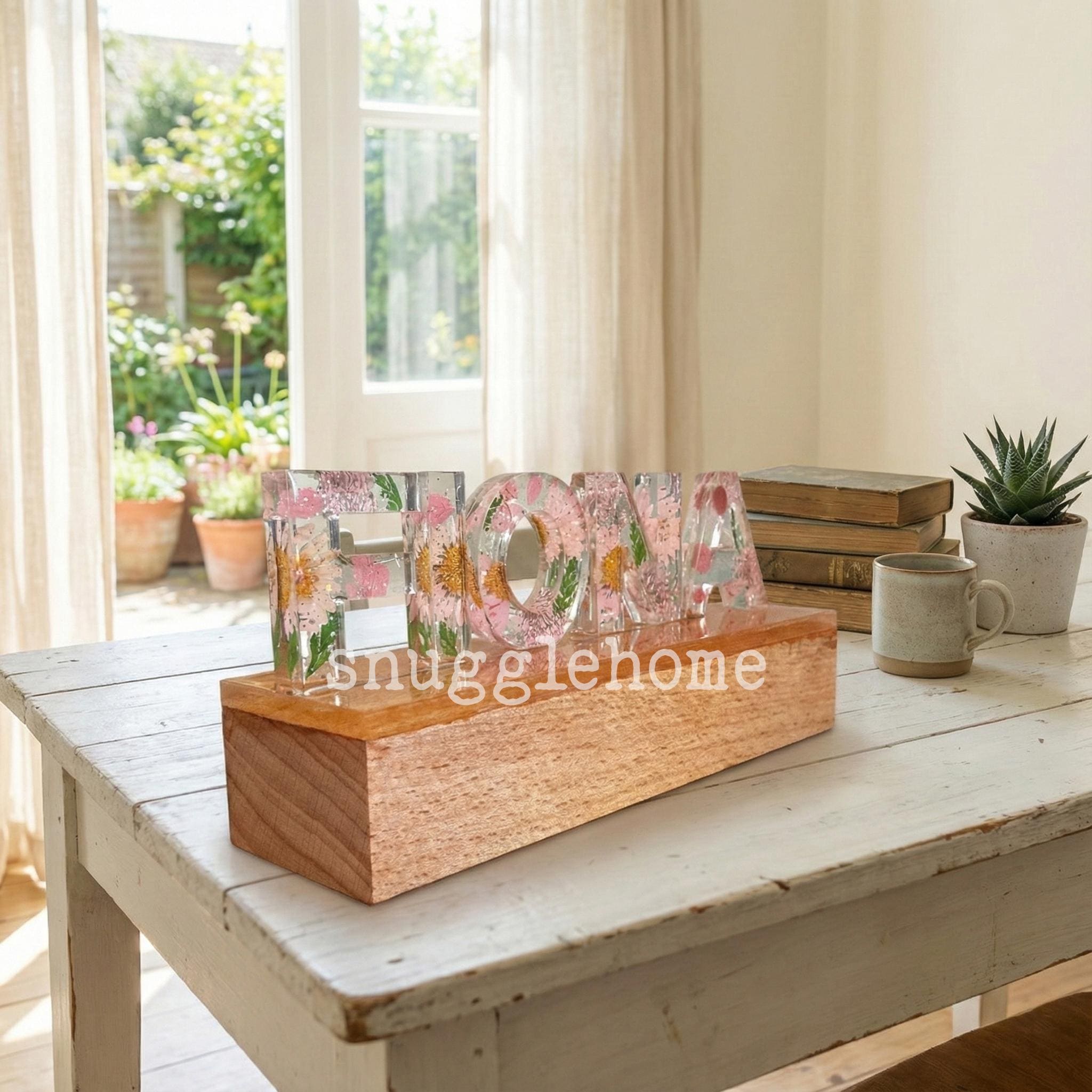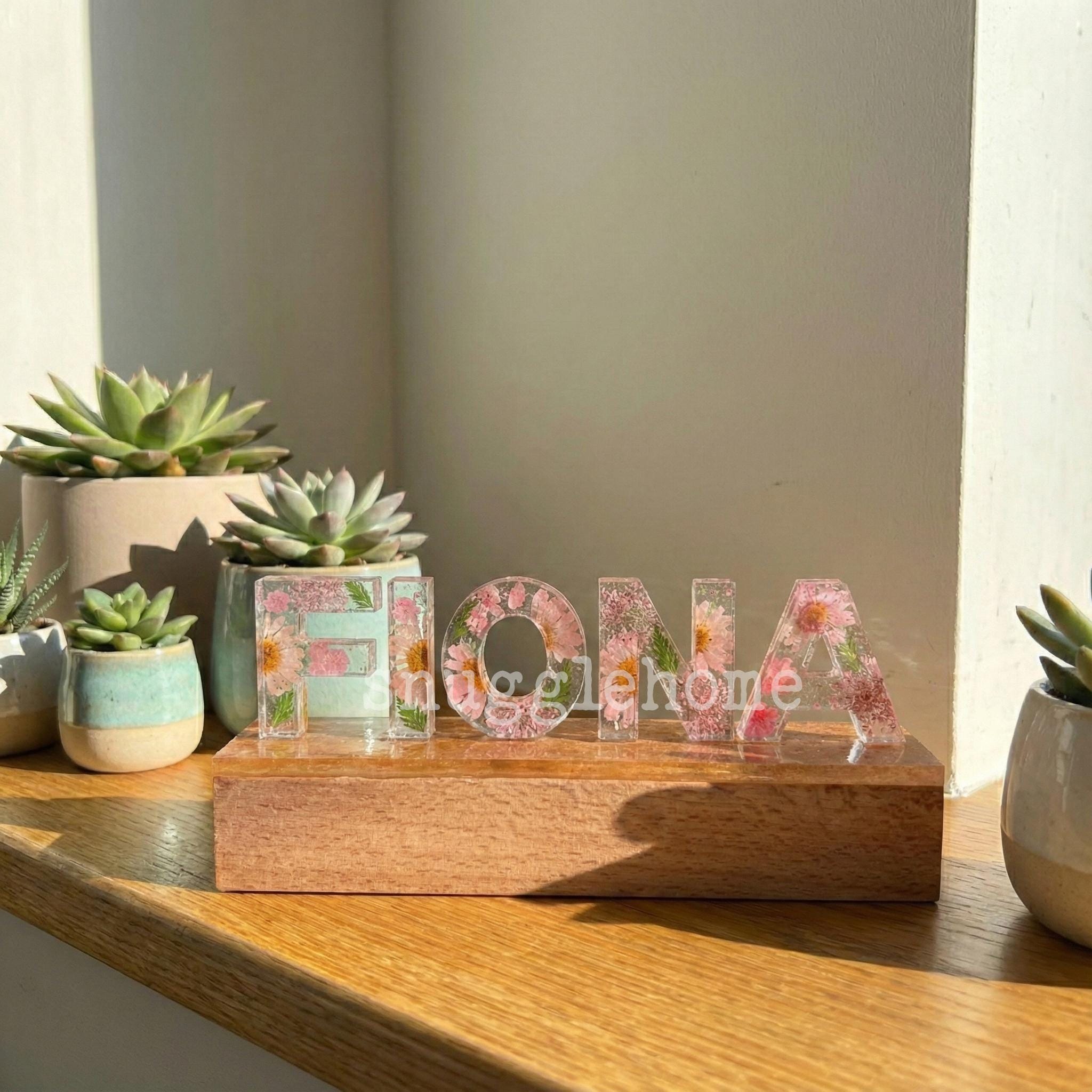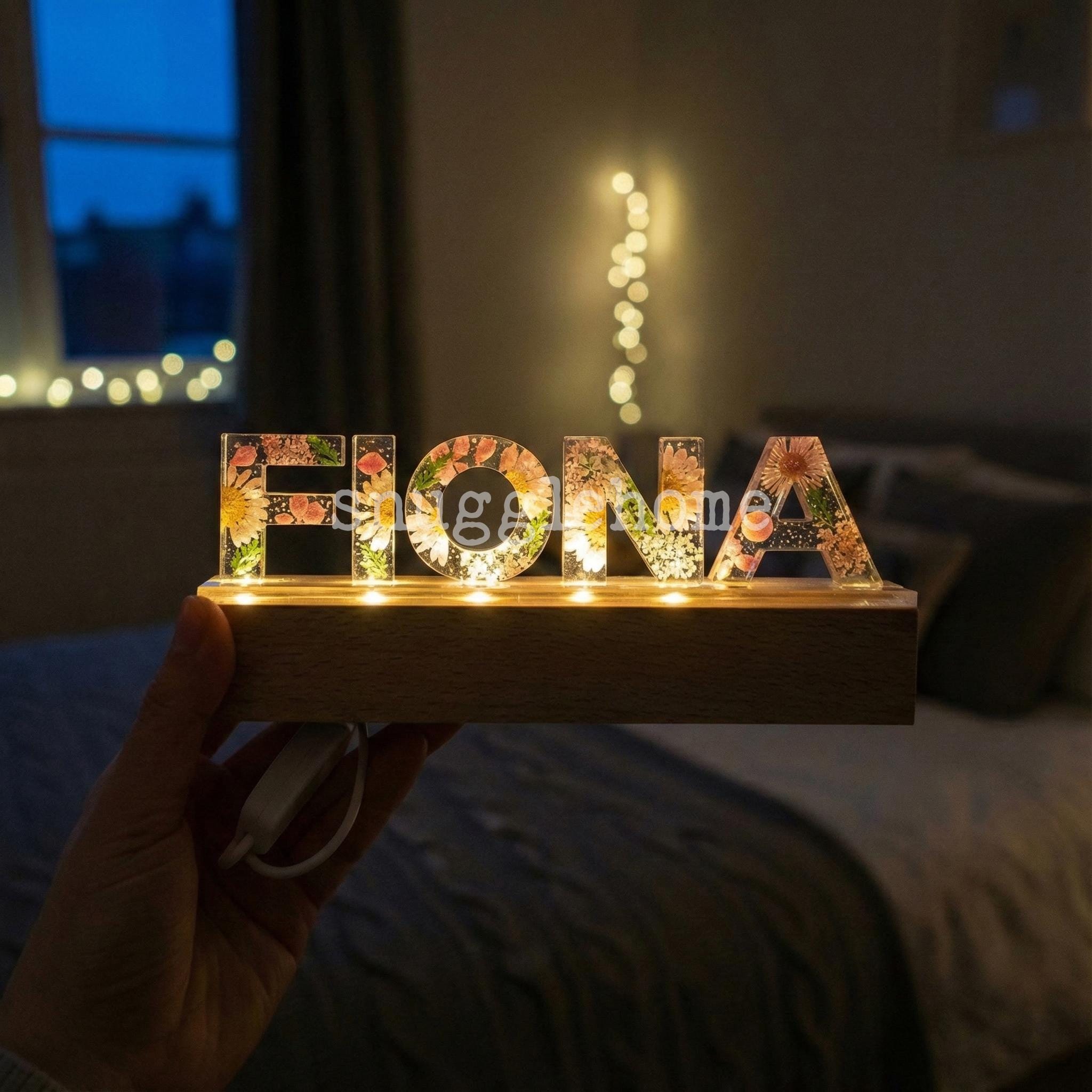 Lámpara de resina con nombre personalizado y flores prensadas rosas auténticas, luz nocturna con letras de flores secas personalizadas, regalo de cumpleaños único para ella, mamá e hijos.