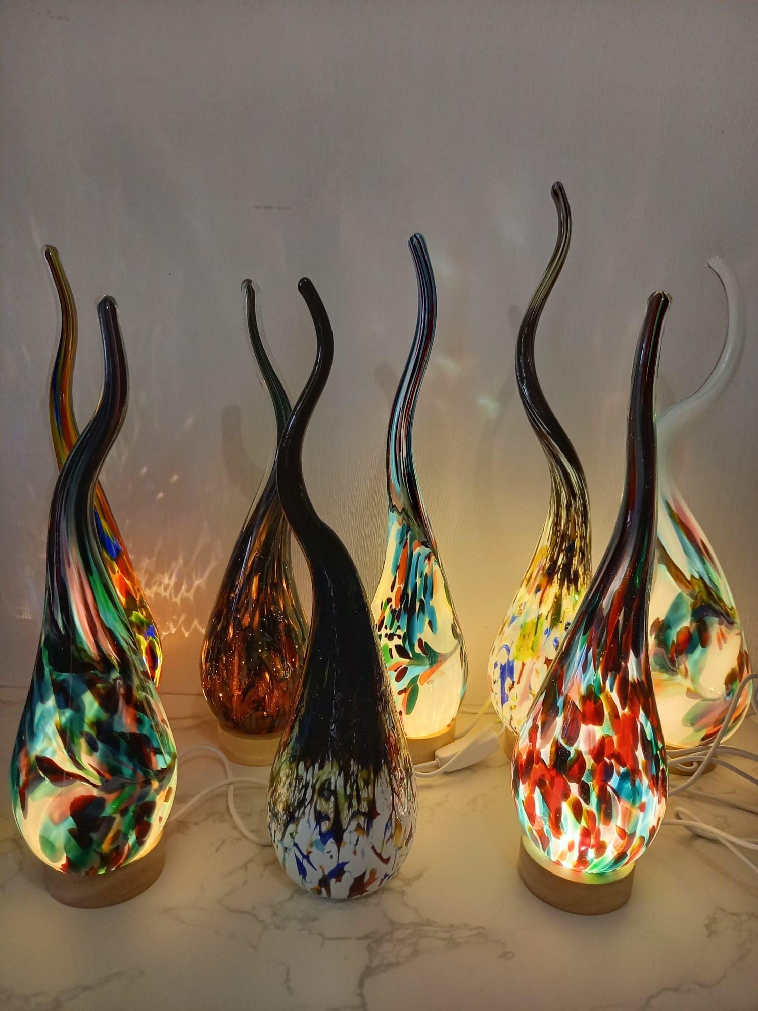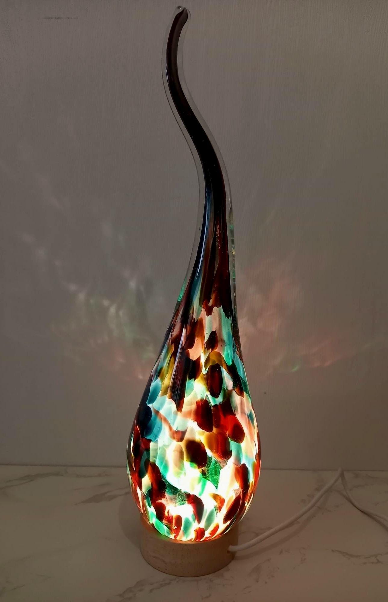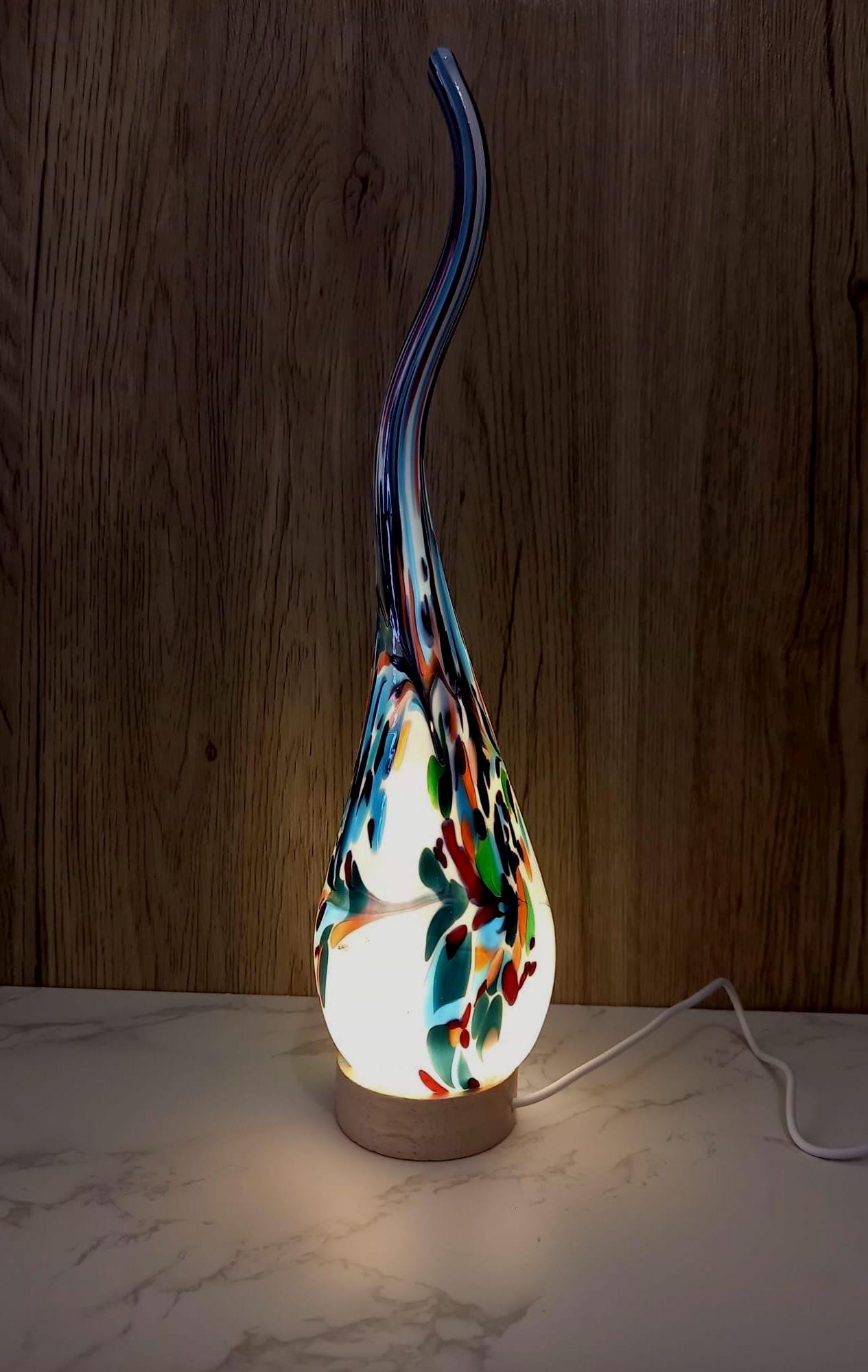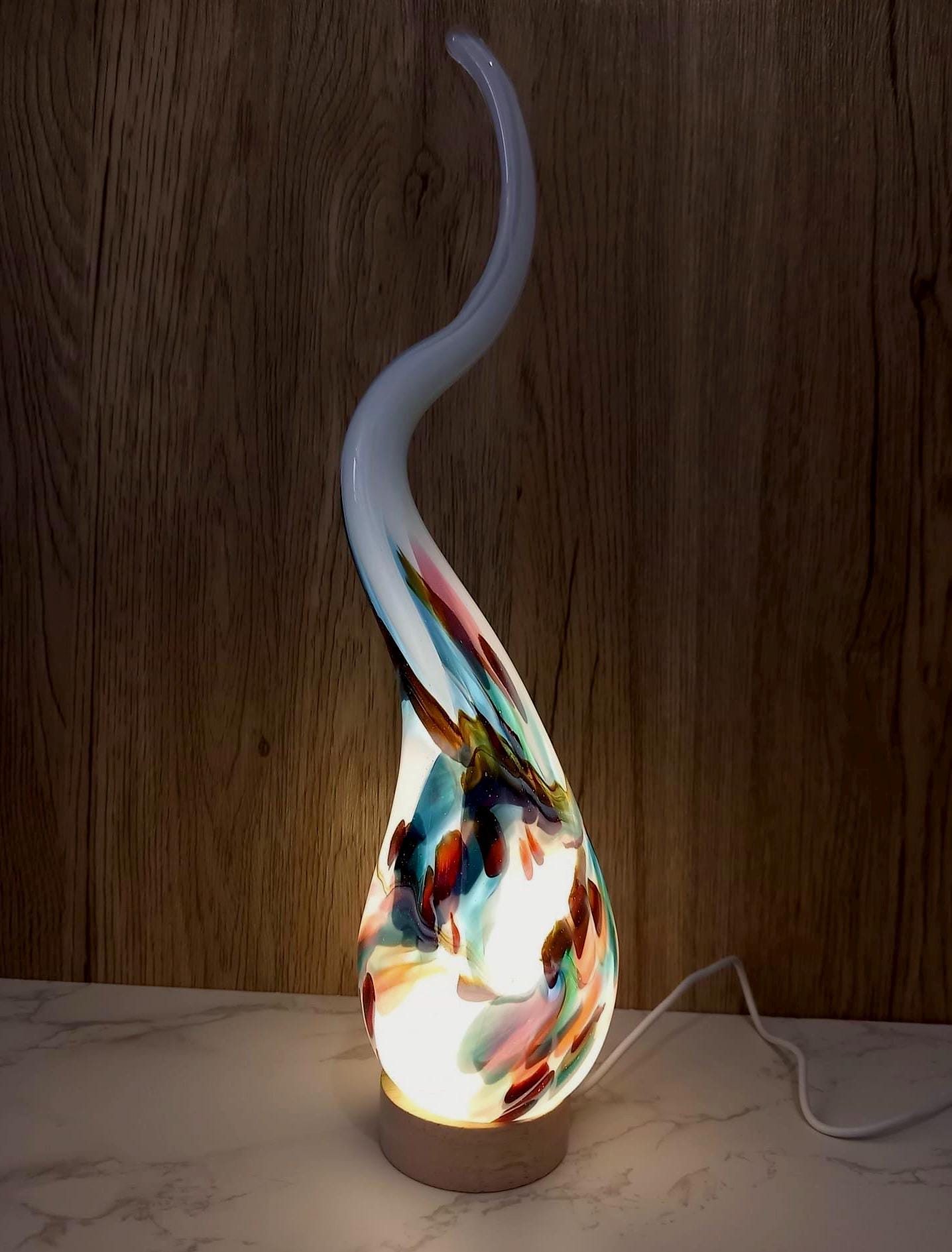 Lámpara de vidrio soplado a mano con espiral: luz ambiental colorida, vidrio artístico polaco